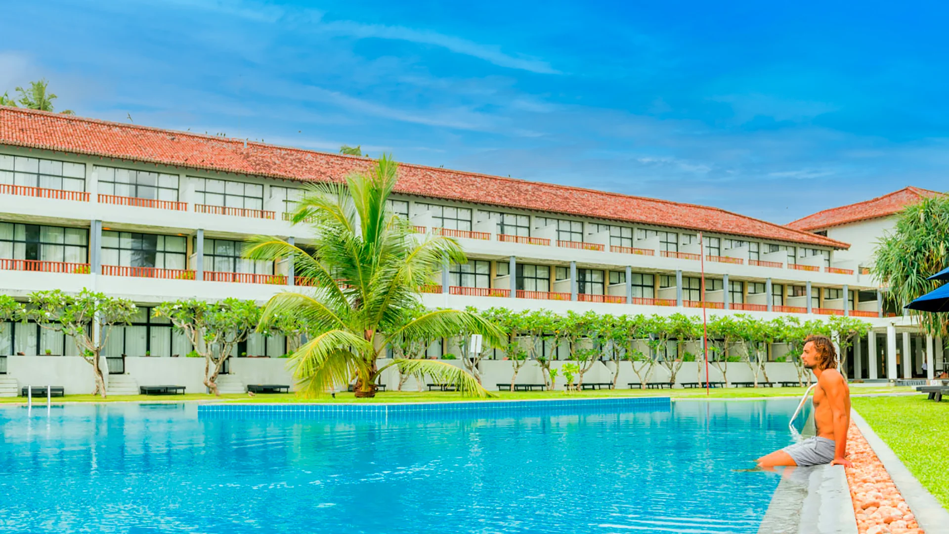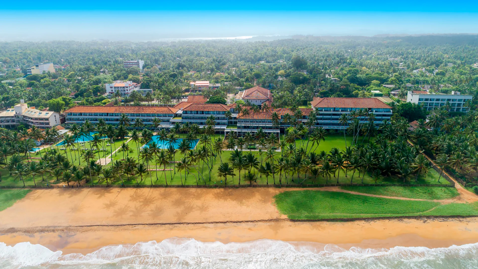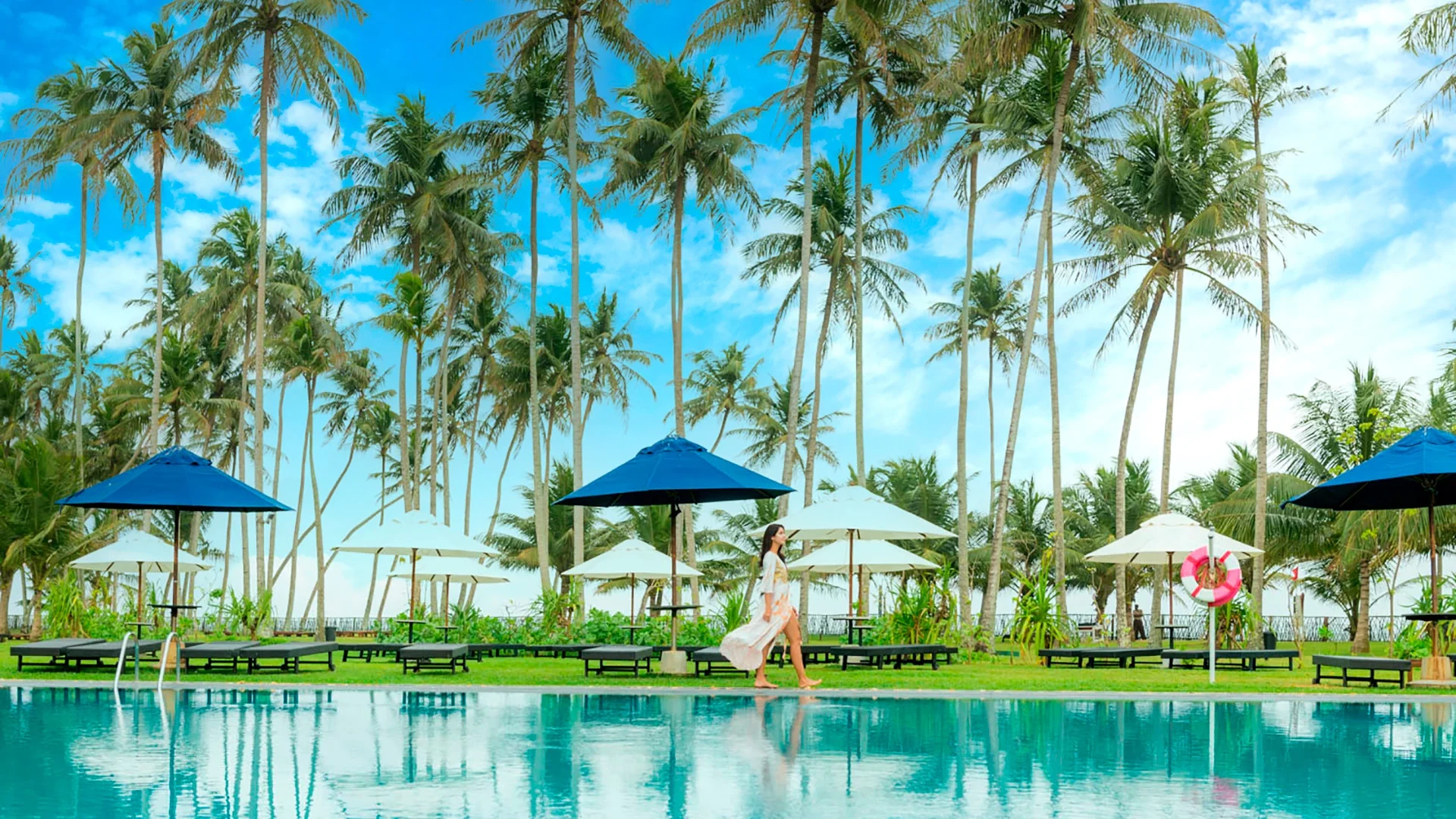 Sinine vee toon, mis peegeldab hotelli nime, valitseb selle erakordselt elegantse hotelli moodsas ja minimalistlikus arhitektuuris, mille on kujundanud arhitekt Geoffrey Bawa. Suur ebatavalise kujuga bassein, tiigid, kosed, purskkaevud ja ojad sobituvad suurepäraselt koloniaalarhitektuuriga hotellimajadega, millel on avatud sisehoov ja sambakäigud. Hoolitsetud muruplatsid ja aed kõrgete kookospalmidega, mis viib eksootilisele liivarannale, on tõeline silmailu. Ideaalne koht romantiliseks kohtinguks või sõpradega lõõgastumiseks. Stiilsed, laitmatult puhtad toad on varustatud kõigi mugavustega. Külalised hindavad suurepärast ja mitmekesist toitu, mis sisaldab kohalikke roogasid ja väljapaistvat rahvusvahelist kööki.